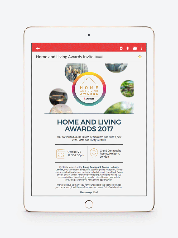 In order to cover the 15 categories, I needed something snappy and easy to change for each category to make the most of my time. I also continued the feel of the promo through to the e-vite I was asked to design and code.
