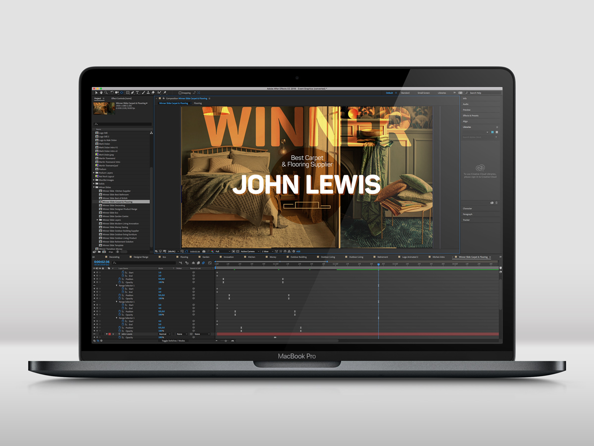 Despite the overwhelming feeling of being thrown in at the deep end, having never done any event graphics before and having an extremely hard deadline, I cracked on using the promo video’s assets as a starting point. Whilst it was tough, with a steep learning curve, it was actually a really fun project to tackle.